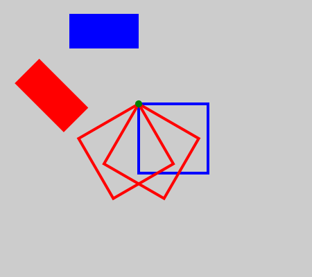 The first rectangle is drawn in solid blue. It is rotated about the origin to draw the solid red rectangle. Rotation is measured in radians. pi radians corresponds to 180 degrees, so the pi/4 radians is 45 degrees.