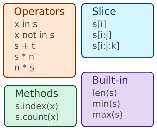 All sequences, including lists, tuples and strings, have the following operators and methods: