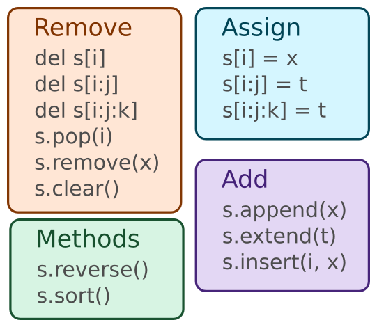Lists (and other mutable sequences), have the following extra operators and methods, in addition to the ones above: