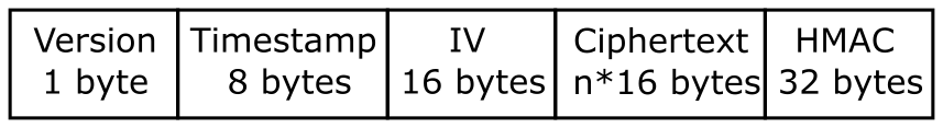 - HMAC - a 256-bit HMAC of the concatenated Version, Timestamp, IV, and Ciphertext fields. The HMAC is signed using the signing key section o fteh Fernet key.