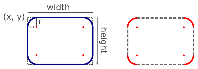 It is defined by its position (x, y), width, height, and the radius r of the rounded corners. As the right-hand side of the diagram shows, a roundrect is made up of four quarter circles of radius r, with fours straight lines between them.