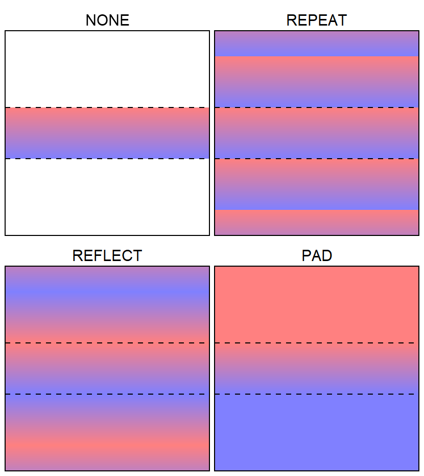cairo.Extend.REFLECT is similar to repeat, but each band is reflected. So instead of the bands moving smoothly from red to blue and then making a step change back to red, each alternate band is flipped. The bands move from red to blue, then blue to red, then red to blue and so on.